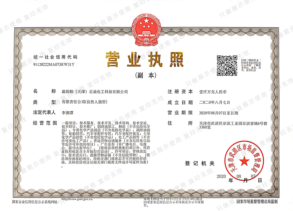 戴姆勒(天津)石油化工有限公司是英國(guó)戴姆勒石油化工集團(tuán)有限公司在中國(guó)大陸設(shè)立的運(yùn)營(yíng)機(jī)構(gòu),是中國(guó)最具規(guī)模的車用化工生產(chǎn)企業(yè)之一,公司與美國(guó)雅富頓公司(Afton),美國(guó)雪佛龍公司合作,產(chǎn)品全部精選國(guó)內(nèi)外優(yōu)質(zhì)基礎(chǔ)油和進(jìn)口復(fù)合添加劑調(diào)制,產(chǎn)品質(zhì)量滿足美國(guó)石油協(xié)會(huì)API、SAE歐洲汽車制造商協(xié)會(huì)ACEA、日本汽車標(biāo)準(zhǔn)化組織JASO的標(biāo)準(zhǔn)規(guī)范,廣泛應(yīng)用于汽車、工業(yè)、工程機(jī)械、航天等領(lǐng)域。另外公司還為奔馳、福田等知名品牌的柴油發(fā)動(dòng)機(jī)提供油品配套服務(wù)。